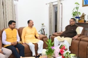 देहरादून, 11 सितम्बर। प्रदेश के कृषि मंत्री गणेश जोशी से आज उनके शासकीय आवास पर उत्तरकाशी के नव निर्वाचित जिला पंचायत अध्यक्ष रमेश चौहान ने भेंट की। इस दौरान मंत्री जोशी ने रमेश चौहान को जिला पंचायत अध्यक्ष निर्वाचित होने पर बधाई देते हुए उनके सफल कार्यकाल की शुभकामनाएं दीं।